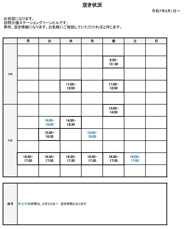 6月~ 訪問介護の空き時間が変更となりましたので、お知らせいたします。